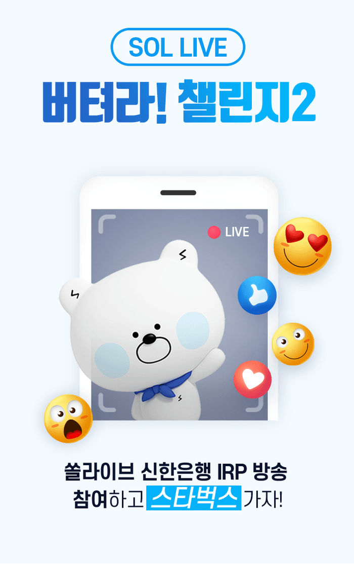 신한은행은 이번 챌린지에 끝까지 참여한 고객을 대상으로 추첨을 통해 1000명에게 스타벅스 기프티콘을, 쏠라이브 시청 후 개인형IRP에 가입한 모든 고객에게 스타벅스 1만원 상품권을 제공한다.