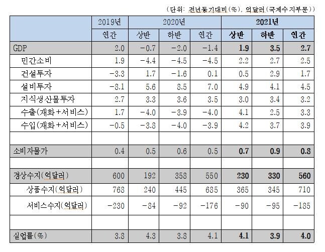 다만 코로나19 3차 확산 여파가 내년 상반기까지 영향을 미칠 수 있고, 대내적으로는 장기간 누적된 경제 여건의 부실화와 대외적으로는 주요국 경기회복 지연 등으로 인해 3% 수준의 성장률을 기대하긴 어렵다고 분석했다.
