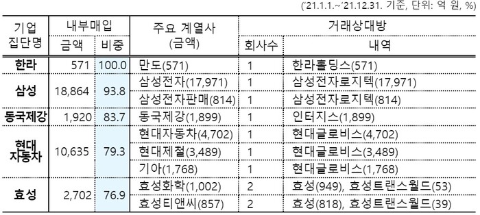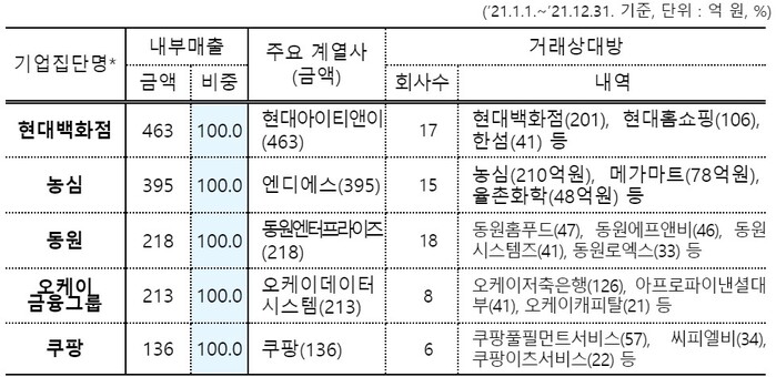 공정거래위원회는 1일 올해 공시대상기업집단 계열회사 간 ‘2021년 상품.용역 거래 현황 등’(내부거래 현황)을 분석・발표했다.