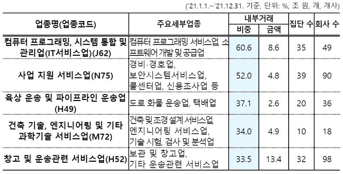 내부거래 금액이 2조 원 이상인 업종 중에서는 컴퓨터 프로그래밍‧시스템 통합 및 관리업(IT서비스업)과 사업 지원 서비스업 분야 비중이 높게 나타났다. 내부거래 금액은 자동차·석유 등 제조업‧건설업‧금융업 분야가 큰 것으로 조사됐다.