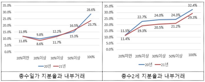 특히 총수 일가‧2세 지분율이 높을수록 내부거래 비중이 높은 경향은 지속되고 있었다.
