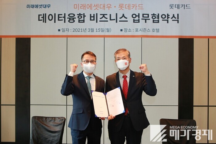 [메가경제=황동현 기자] 미래에셋대우와 롯데카드는 지난 15일 서울 광화문 포시즌스호텔에서 ‘데이터 융합 비즈니스를 위한 업무협약식'을 열었다. 이번 협약은 미래에셋대우의 금융투자 데이터와 롯데카드의 소비 데이터가 결합된 고객의 소비패턴 트렌드 공동 연구를 목표로 이루어졌다.