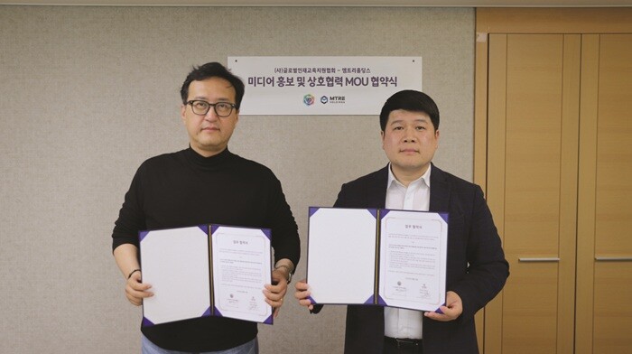 | ▲글로벌인재교육지원지원협회 이재무 협회장(왼쪽)과 MTRE홀딩스 김종열 대표이사가 16일 외국인 유학생의 국내 생활 정착을 위한 교육 및 생활 지원사업 활성화를 목적으로 업무 협약을 체결했다. |