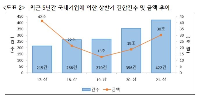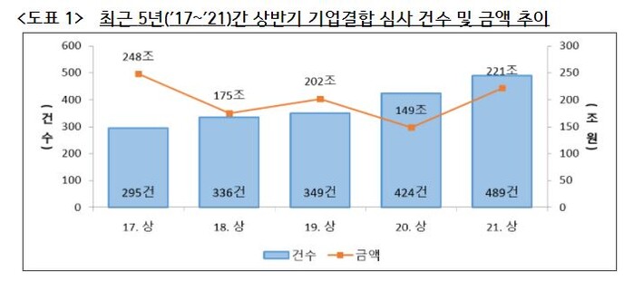 5일 공정거래위원회가 공개한 ‘2021년도 상반기 기업결합 동향’에 따르면, 올해 상반기 국내 대기업집단에 의한 기업결합이 지난해 같은 기간보다 86.7% 증가한 것으로 나타났다.