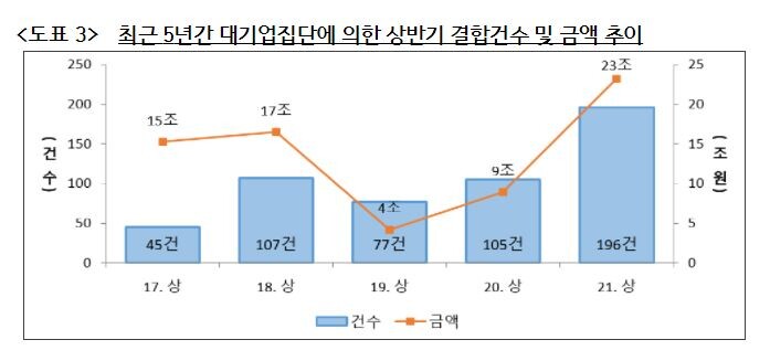 대기업집단은 자산 5조 원 이상인 공시대상기업집단을 뜻한다. 대기업집단의 올 상반기 국내 기업결합 규모는 23조 2000억 원으로 전체 국내기업에 의한 결합 금액 총 30조 2000억 원의 76.8%에 달하는 것으로 조사됐다. 이는 전년보다 160.7% 늘어난 금액이다.