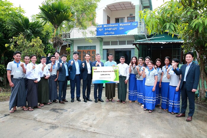 ▲황병우 행장은 DGB MFI 본사에서 임직원들과 간담회를 실시하고 현지에 진출한 지역기업인 고려전선 미얀마를 방문하여 미얀마 시장상황과 애로사항을 청취했다. 황병우 행장(왼쪽 열번째)이 미얀마 에야와디 지역에 성금 전달하고 기념사진을 촬영한 모습[사진=DGB대구은행] |