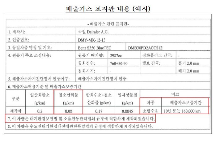 또 2012년 4월∼2018년 11월 경유 승용차 내부에 부착한 배출가스 표지판에는 ‘본 차량은 대기환경보전법 및 소음진동관리법의 규정에 적합하게 제작되었습니다’라고 표시를 한 것으로 확인됐다.