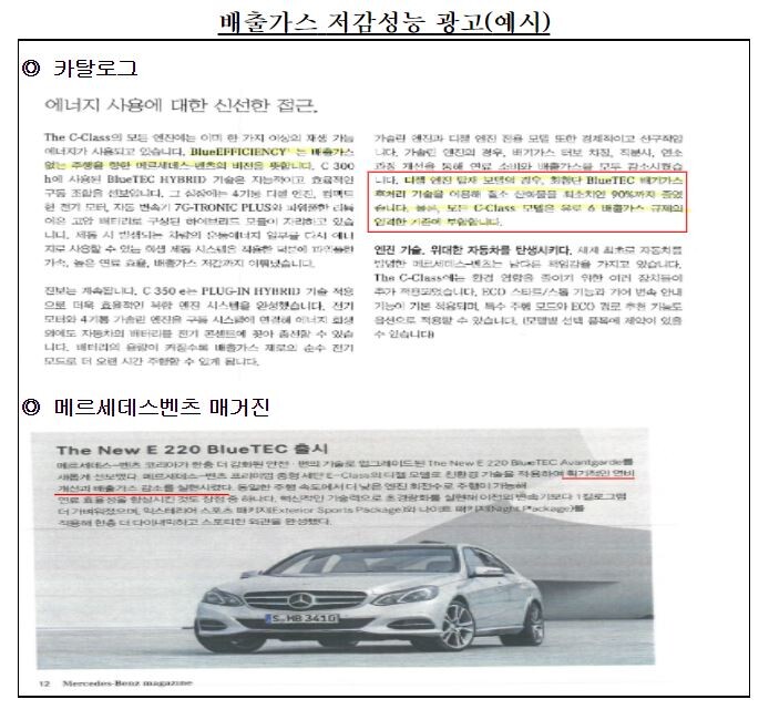 공정위 조사에 따르면, 벤츠는 2013년 8월∼2016년 12월 메르세데스벤츠 매거진, 카탈로그, 브로슈어, 보도자료 등을 통해 자사 경유 승용차가 대기오염물질인 질소산화물을 최소치인 90%까지 줄이고, 유로6 배출가스 기준을 충족하는 성능을 가지고 있다고 광고했다.