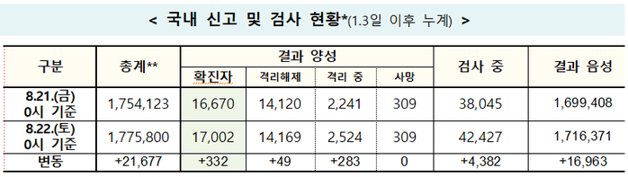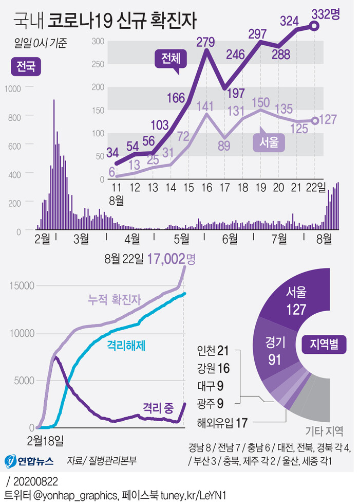 질병관리본부 중앙방역대책본부(방대본)는 22일 0시 기준으로 전날 대비 코로나19 신규 확진자가 332명으로 전날(332명)에 이어 이틀연속 300명대를 기록했다.
