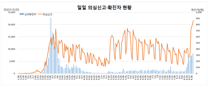 ▲ 코로나19 일일 의심신고 및 확진자 현황. [출처= 중앙방역대책본부] |