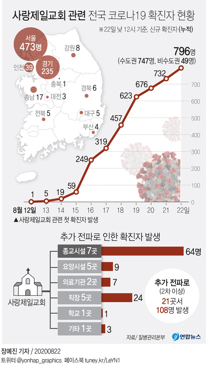 사랑제일교회 관련 사례는 접촉자 조사 중 64명이 추가 확진되어 현재까지 누적 확진자는 총 796명으로 증가하며 800명을 눈앞에 뒀다.