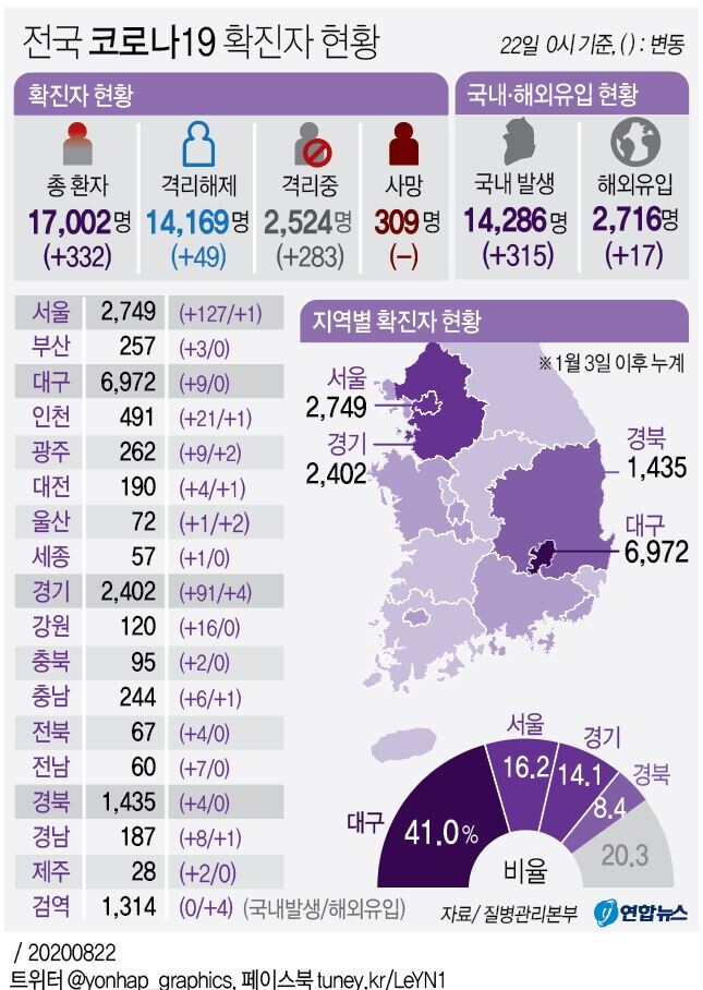 이로써 지금까지 코로나19 국내 누적 확진자는 1만7천명을 넘어서며 총 1만7002명으로 증가했고, 해외유입 누적 확진자는 2716명으로 늘었다.