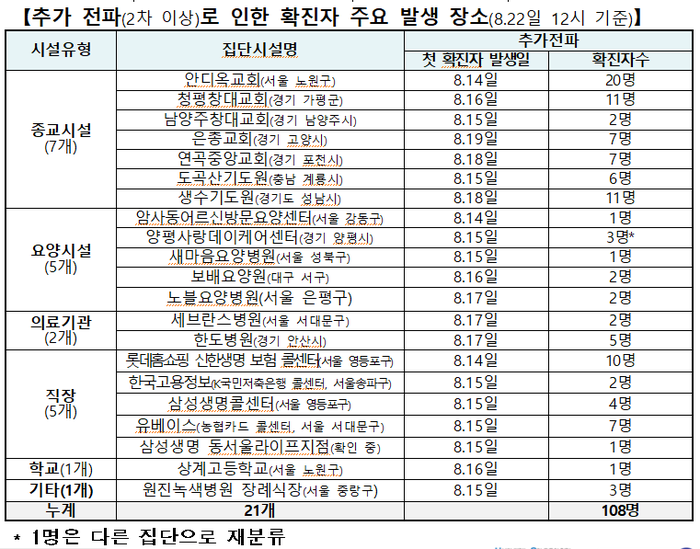 168개 장소는 직장 64곳, ‘학교·학원’ 43곳, 사회복지시설 17곳, 종교시설 16곳, ‘의료기관’과 ‘어린이집·유치원’ 각 11곳, 콜센터 4곳, 기타 2곳이다.