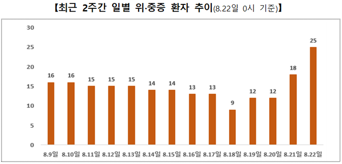 최근 2주간(8월 9~22일) 65세 이상 확진자 비율은 32%였으며, 최근 들어 고령자가 늘면서 위·중증환자도 증가하는 추세다.