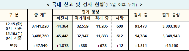▲ 16일 0시 기준 코로나19 국내신고 및 검사 현황. [출처= 중앙방역대책본부] |