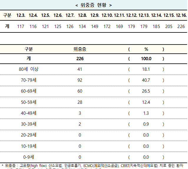 위중중환자는 하루 전 20명에 이어 이날도 21명이 늘면서 이틀 새 41명이나 급증했다. 16일 0시 현재 위중증 환자는 총 226명이다.
