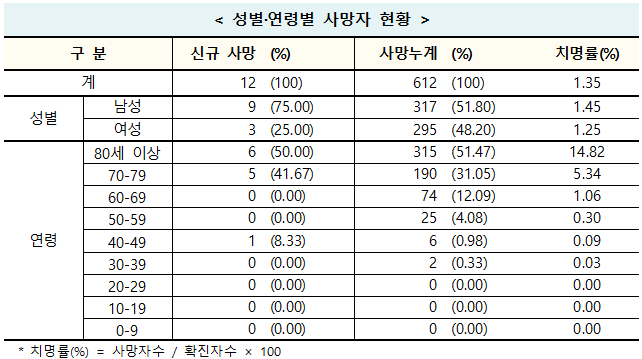 사망자는 하루 새 12명이 또 숨지며 누적 612명으로 치명률은 1.35%를 기록했다. 하루 전 13명으로 일일 최다 사망자를 기록한 데 이어 이틀 새 무려 25명이나 목숨을 잃었다.