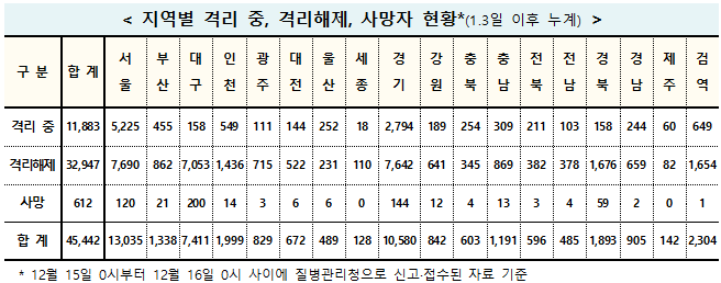 ▲ 16일 0시 기준 코로나19 격리해제 및 사망자 현황. [출처= 중앙방역대책본부] |