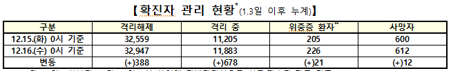▲ 16일 0시 기준 코로나19 확진자 관리 현황. [출처= 중앙방역대책본부] |