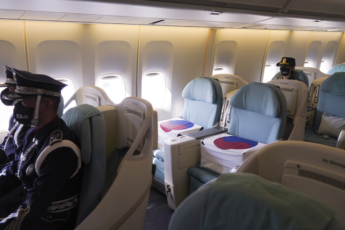 ▲ 22일(현지시각) 미국 히캄 공군기지 19번 격납고에서 열린 한미 유해 상호 인수식에서 인수된 유해가 대통령 전용기 공군1호기 좌석에 안치 되어 있다. [호놀룰루=연합뉴스] |