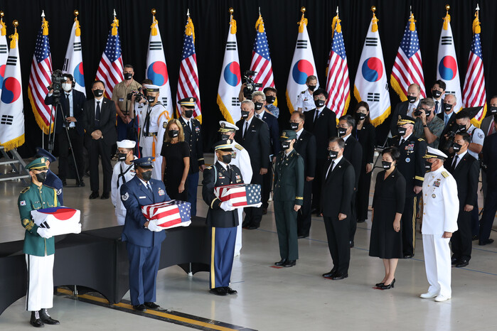 청와대에 따르면, 한·미 양국은 22일 오후(현지시간) 미국 하와이주 호놀룰루 히캄 공군기지 19격납고에서 ‘한·미 유해 상호 인수식’을 개최했다.