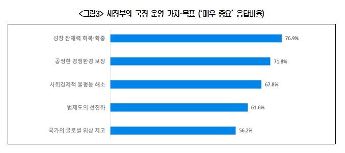 뒤이어 ‘공정한 경쟁환경 보장(71.8%)’, ‘사회경제적 불평등 해소(67.8%)’, ‘법 제도의 선진화(61.6%)’, ‘국가의 글로벌 위상 제고(56.2%)’ 순으로 응답 비율이 높았다.