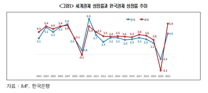 대한상의는 이 결과에 대해 “우리 경제의 잠재성장률이 하락하면서 세계 경제 전체의 성장률보다 뒤처지는 현 상황을 방증한다”라고 분석했다.