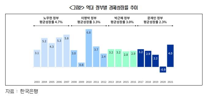 대한상의에 따르면 실제 우리나라의 경제성장률은 역대 정부마다 평균 1%포인트씩 떨어지는 모습을 보이며 세계 기준과의 격차가 벌어져 왔다.
