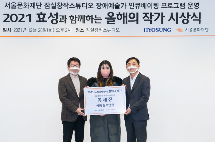 | ▲ (왼쪽부터) 이창기 서울문화재단 대표이사, 수상자 홍세진 작가, 최형식 효성 커뮤니케이션실 상무가 시상식에 참석한 모습 [사진=효성 제공] |