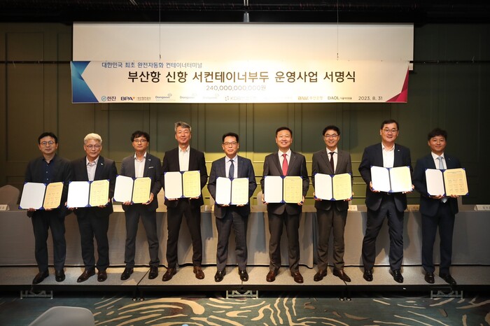 | ▲ (왼쪽부터) 김기업 한진 전무, 진규호 부산항만공사 본부장, 안영복 동원부산컨테이너터미널 대표, 김창훈 동원글로벌터미널부산 대표, 박성순 동원로엑스 대표, 김영진 산업은행 지역성장부문 부행장, 이진균 한국해양진흥공사 본부장, 이상룡 BNK부산은행 상무, 정우송 다올자산운용 본부장. [사진=산업은행] |
