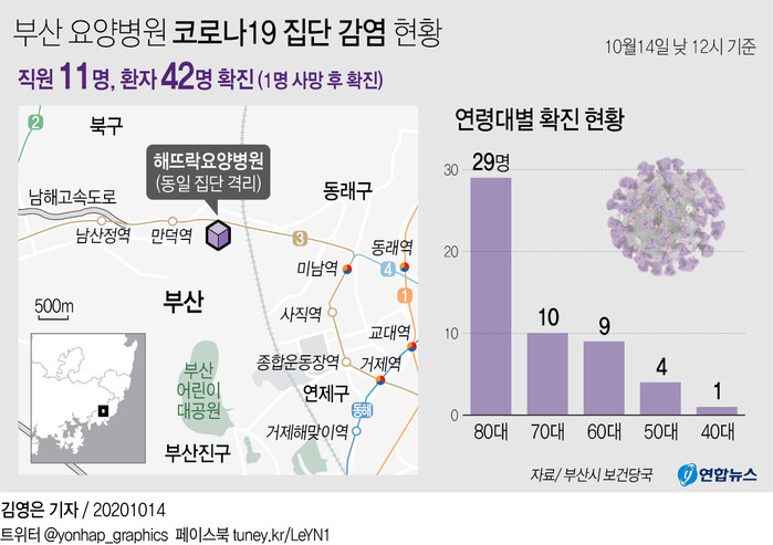 ▲ 부산 요양병원 코로나19 집단감염 현황. [그래픽= 연합뉴스] |