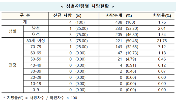 위중·중증환자는 85명으로 전날보다 6명이 줄어들었지만 하루 새 4명이 더 숨져 누적 사망자는 438명으로 늘었다. 치명률은 1.76%를 기록했다.