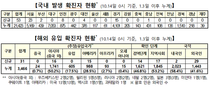 신규 확진자 84명 중 지역사회에서 감염된 것으로 추정되는 국내발생은 53명으로 집계됐고 해외유입 사례는 31명이 확인됐다. 해외유입 누계는 총 3466명으로 늘어났다.