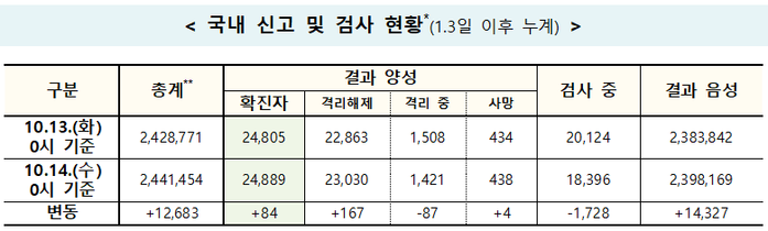 중앙방역대책본부(방대본)는 14일 0시 기준으로 전날 대비 코로나19 신규 확진자 수가 84명 추가됐다고 밝혔다. 이로써 지금까지 누적 확진자는 총 2만4889명이 됐다.