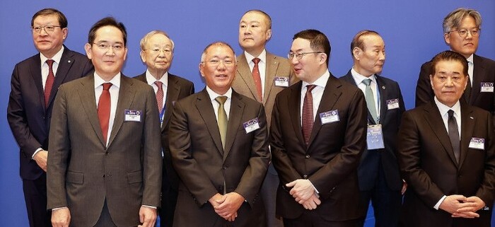 | ▲5일 한·중 비즈니스포럼에서 (앞줄 왼쪽부터) 이재용 삼성전자 회장, 정의선 현대차그룹 회장, 구광모 LG 그룹 회장, 장인화 포스코홀딩스 회장. 뒷줄 왼쪽부터 허태수 GS그룹 회장, 손경식 CJ그룹 회장, 구자은 LS홀딩스 회장, 최병오 패션그룹형지 회장, 장철혁 SM엔터테인먼트 대표 [사진=연합뉴스] |