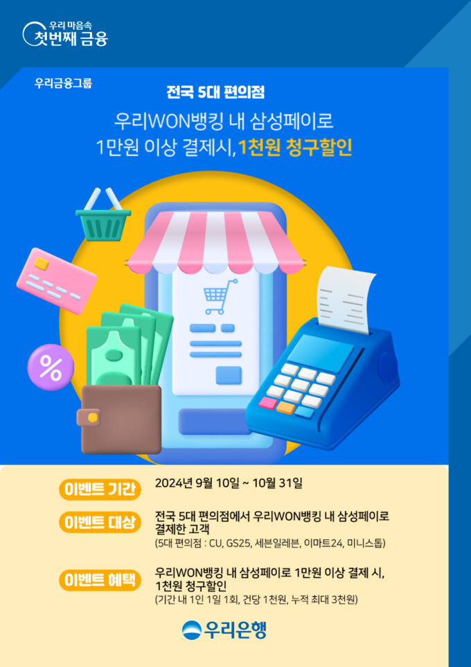 [메가경제=문혜원 기자] 우리은행과 우리카드는 우리WON뱅킹 삼성페이로 5대 편의점(CU, GS25, 세븐일레븐, 이마트24, 미니스톱)에서 1만원 이상 결제 시 1000원을 할인해주는 청구할인 이벤트를 이달 10일부터 10월31일까지 실시한다고 10일 밝혔다.