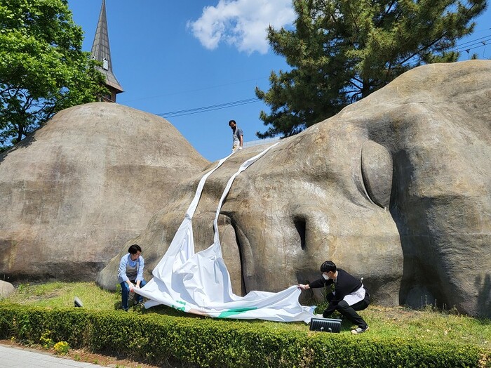 ▲ 대구 달서구가 2일 실외 마스크 착용 의무 완화에 맞춰 상화로에 있는 길이 20m, 높이 6m짜리 원시인 조형물 '2만 년 역사가 잠든 곳'에 씌운 마스크를 벗겨냈다고 밝혔다. [서울=연합뉴스] |