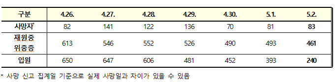 지난 일주일(4월 26일~5월 2일) 간 일평균 확진자 수는 5만2303명이다.