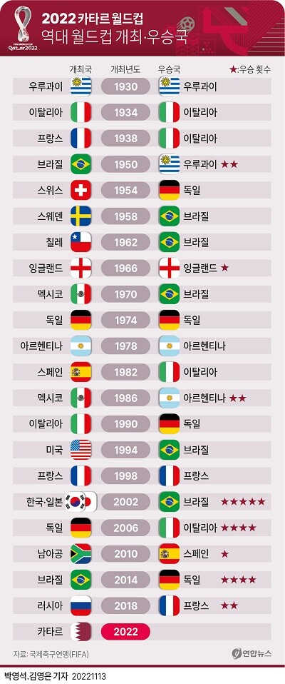 | ▲ 역대 월드컵 개최국 및 우승국. [그래픽=연합뉴스] |