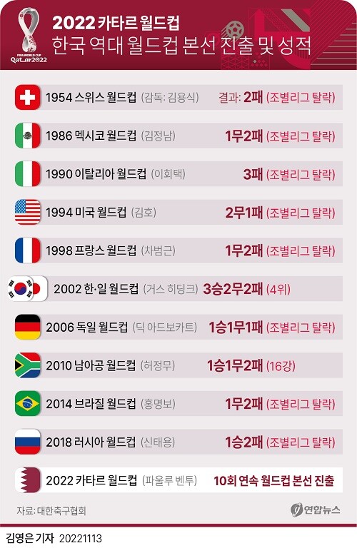 | ▲ 한국 역대 월드컵 본선 진출 및 성적. [그래픽=연합뉴스] |