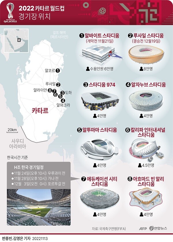 | ▲ 2022 카타르 월드컵 8개 경기장 위치. [그래픽=연합뉴스] |