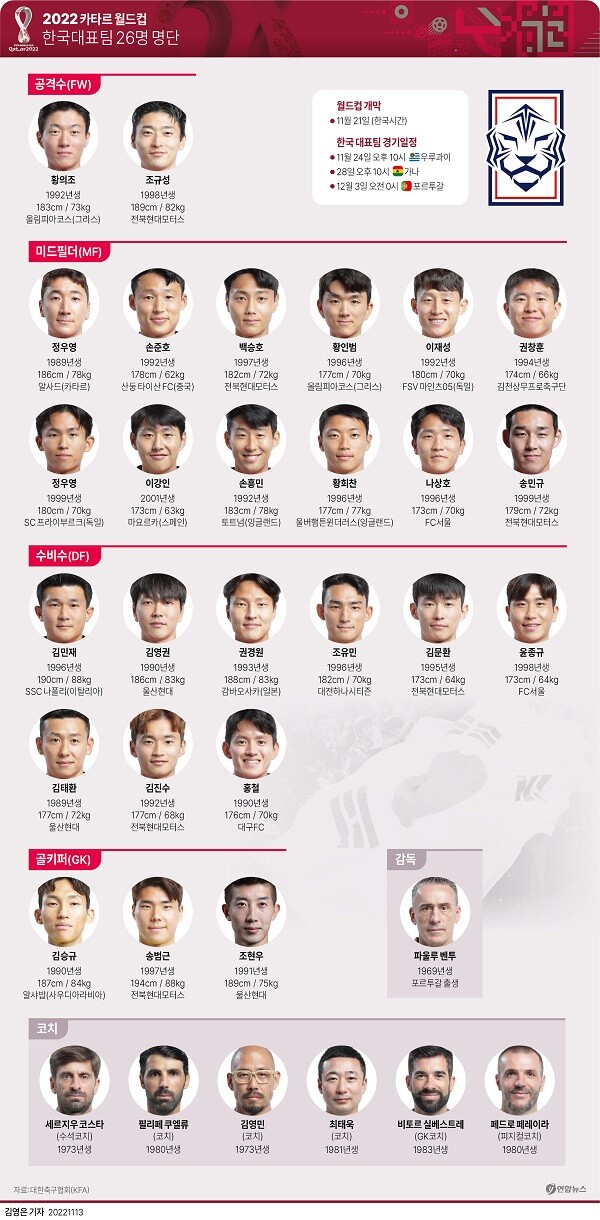 | ▲ 2022 카타르 월드컵 한국대표팀 26명 명단. [그래픽=연합뉴스] |