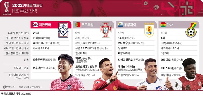 | ▲ 2022 카타르 월드컵 H조 주요 전력 분석. [그래픽=연합뉴스] |