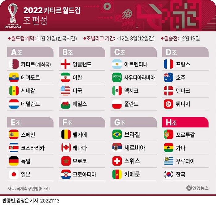 | ▲ 2022 카타르 월드컵 조 편성. [그래픽=연합뉴스] |
