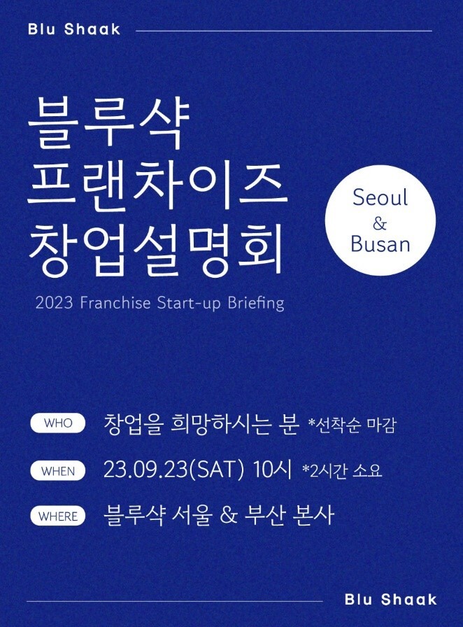 블루샥은 지난 8일 부산 본사 사무실과 서울 지사 사무실에서 진행한 첫 창업설명회가 열띤 호응을 얻으며 성황리에 마무리됨에 따라 미처 참여하지 못한 예비 가맹점주들을 위해 두 번째 창업설명회를 마련했다고 설명했다.