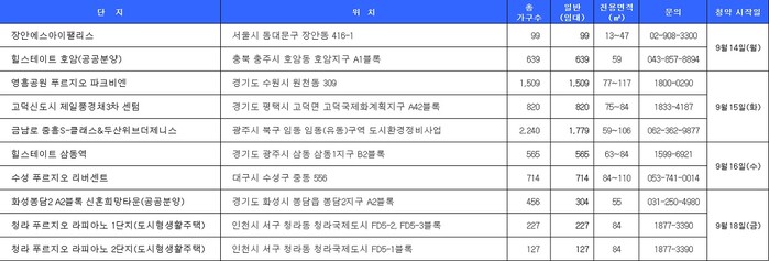9월 셋째 주 당첨자를 발표하는 단지는 10곳이다.
