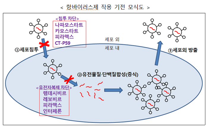 ▲ 항바이러스제 작용 기전 모식도. [출처= 식품의약품안전처 제공] |