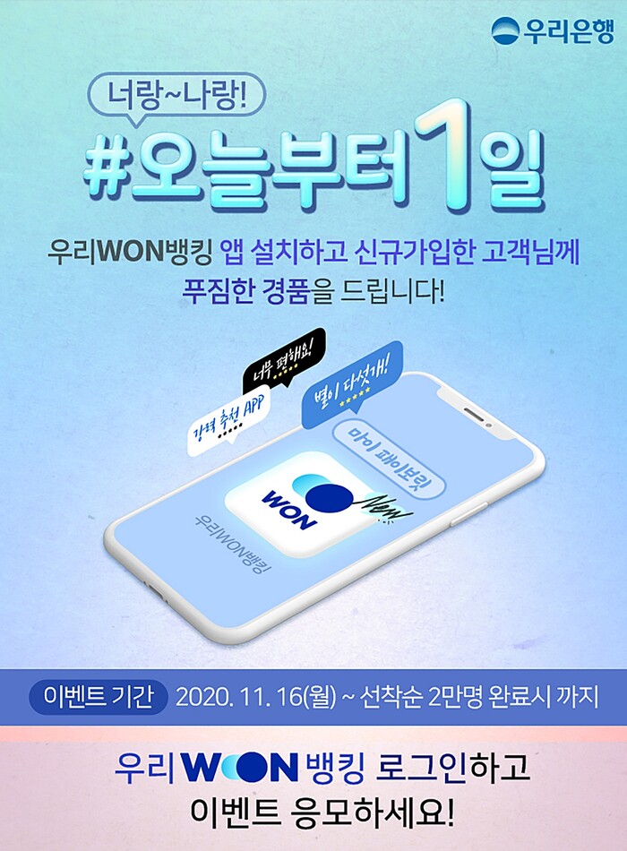 [메가경제=최낙형 기자] 우리은행은 모바일뱅킹인 우리WON뱅킹 최초 가입고객 2만명을 대상으로 ‘너랑 나랑~! #오늘부터 1일’ 이벤트를 실시한다고 19일 밝혔다