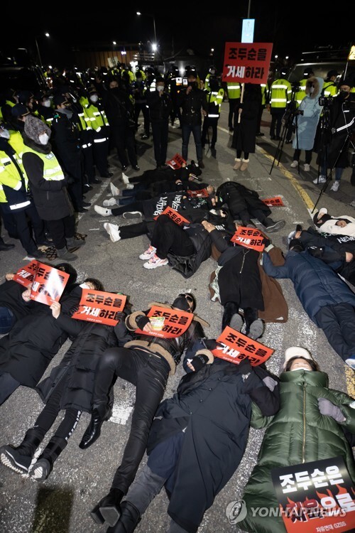 ▲ 아동 성범죄자 조두순이 출소한 12일 오전 구로구 서울남부교도소 앞에서 조두순의 출소를 반대하는 집회 참가자들이 바닥에 누워 구호를 외치고 있다. [서울= 연합뉴스] |