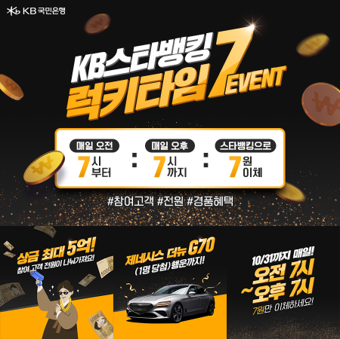 [메가경제= 최낙형 기자] KB국민은행은 ‘돈 버는 습관 KB스타뱅킹 럭키타임 7’ 이벤트를 이달 말까지 진행한다고 14일 밝혔다.